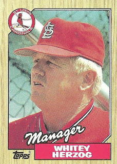 Sometime I can't help but feel slightly guilty for not being more timely with posts. After almost 3 weeks after the announcement that Hall of Fame manager Whitey Herzog passed away at the age of 92, I am just now paying tribute. I'll admit that outside of a not all that amusing personal anecdote, I don't have much to say about Mr. Herzog. And yet, as I have done with Hall of Famers in the past, I offer my personal tribute to the man with the Top 5 cards of his in my collection.